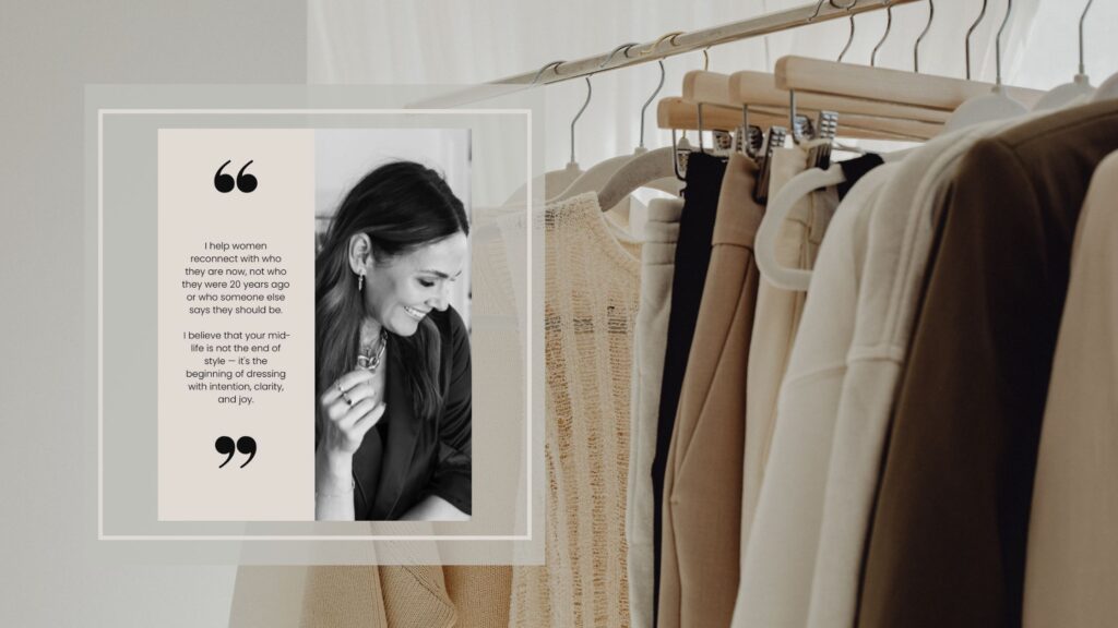 I knew style wasn’t just about clothes — it was about taking back power, presence, and permission to be fully seen. That’s why I became a style mentor. I had to create my own signature skill-set — a guide, a listener, a mirror. I help women reconnect with who they are now, not who they were 20 years ago or who someone else says they should be. I believe that your mid-life is not the end of style — it’s the beginning of dressing with intention, clarity, and joy.