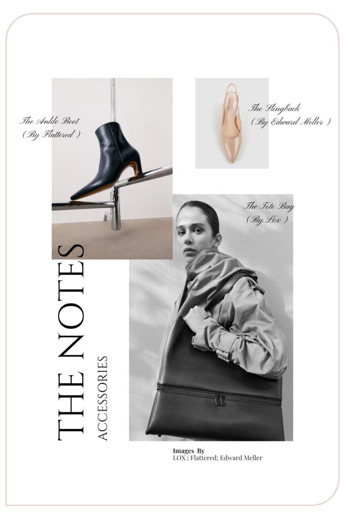 The Style Notes: LOX, The Tote Bag; Edward Meller The Arilla Slingbacks; Flattered The Xena Boot—for every style and grace moment.