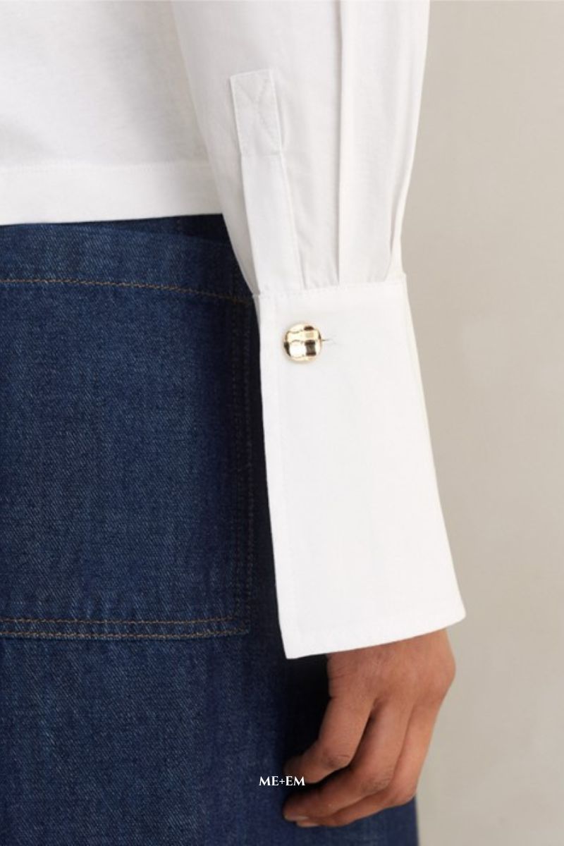 The white shirt becomes the hero when layered under a sweater – with wide cuffs and collar detail creating impact.